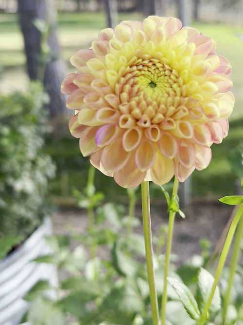 Snoho Doris is beautiful all season long, but a chameleon with continually changing color based on temperature, light intensity, and light duration, which I love about her. The color constants are a cantelope coral, peachy, apricot-base, but also with some yellowish undertones. I got my mother stock from my friend Andi after swearing I did not need another peach dahlia variety, and when she insisted that I really DID need another one, I am so glad I succumbed to her peer pressure. When it comes to great stems for cutting, lots of tubers that divide and store easily, Snoho Doris is unbeatable.